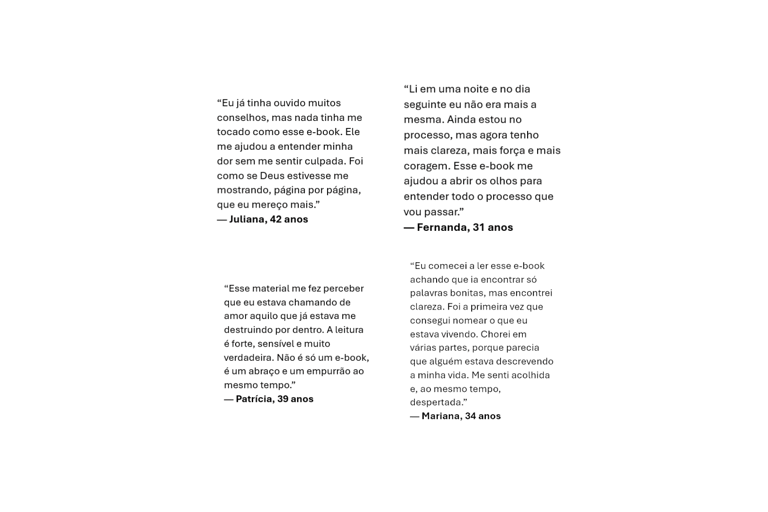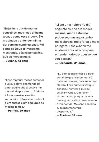 Este e-book é para mulheres que sentem que estão vivendo uma relação que machuca, confunde, diminui ou esgota emocionalmente, e desejam encontrar clareza, força e direção para recomeçar.